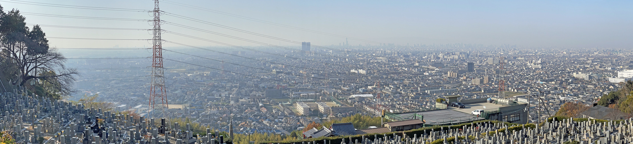 八尾市の東の山裾、奈良県境にある信貴霊苑から西に大阪平野を望むと、今日は小豆島も四国も六甲山系も靄で霞んでいます。中国からの黄砂かもしれません。