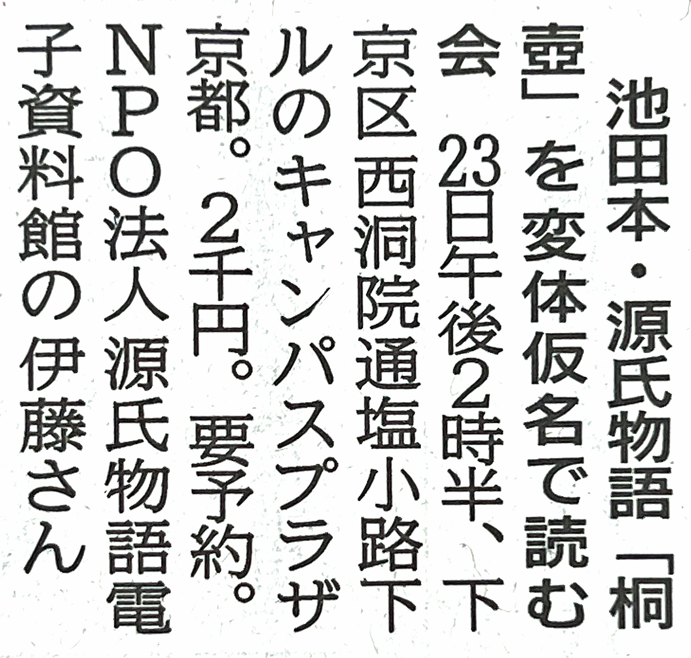 一昨日の京都新聞市内版「まちかど」欄に、NPO法人〈源氏物語電子資料館〉が主宰する、池田本『源氏物語「桐壺」』の講座に関する案内記事を掲載していただきました。