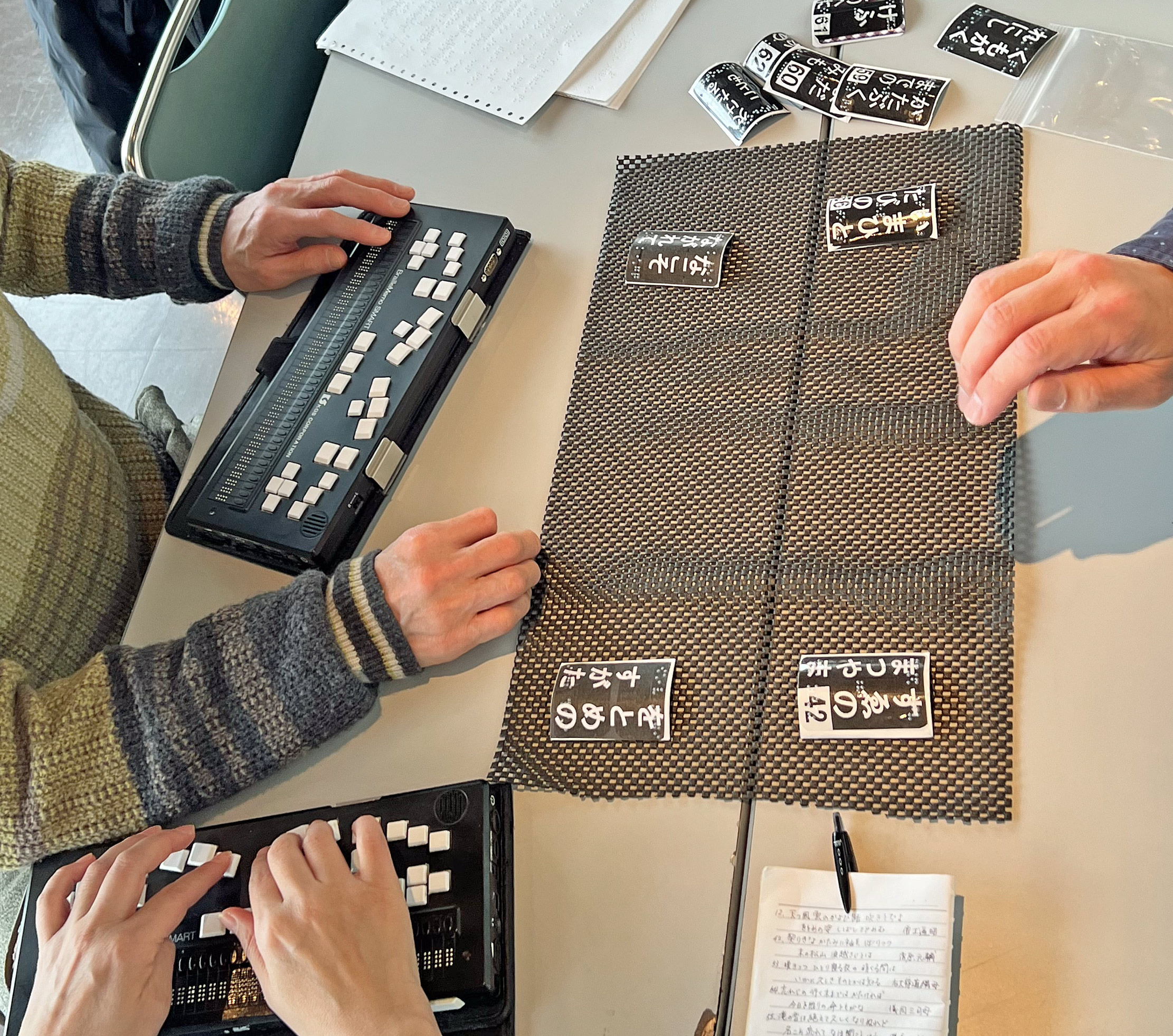 サポート役の方が読まれた和歌をブレイルメモに入力すると、左手の指でその歌を読み取り、右手でカルタを取ります。その早さは感動ものです。