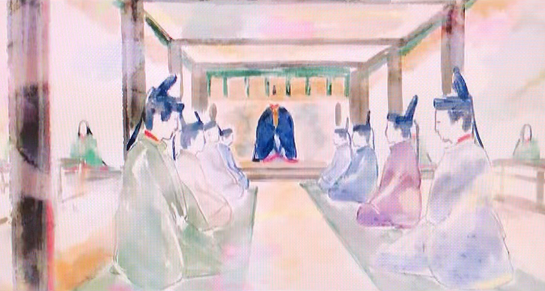 最初に、映画『ちはやふる』の一場面を映写しました。平兼盛(40番歌)と壬生忠見(41番歌)の歌が話題になる2分ほどの場面を映し、そこで語られるこの歌の意味と状況を確認することから始めました。