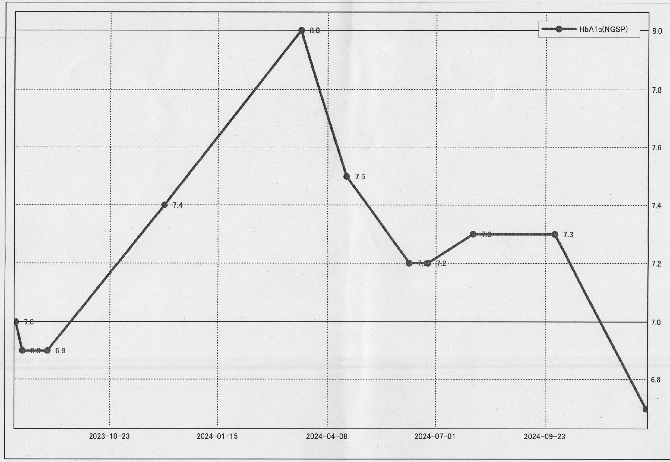 まず糖尿病に関しては、指針となっているヘモグロビンA1cの値が、格段によくなっていました。これは、ヘモグロビンA1cが「7.3」だった9月から後、1日6回食を5回食に減らしたことが功を奏したと言えるでしょう。夜の10時に6回目の食事をしていたのを、極力減らして9時にはその日の食事を終えるようにしたのです。