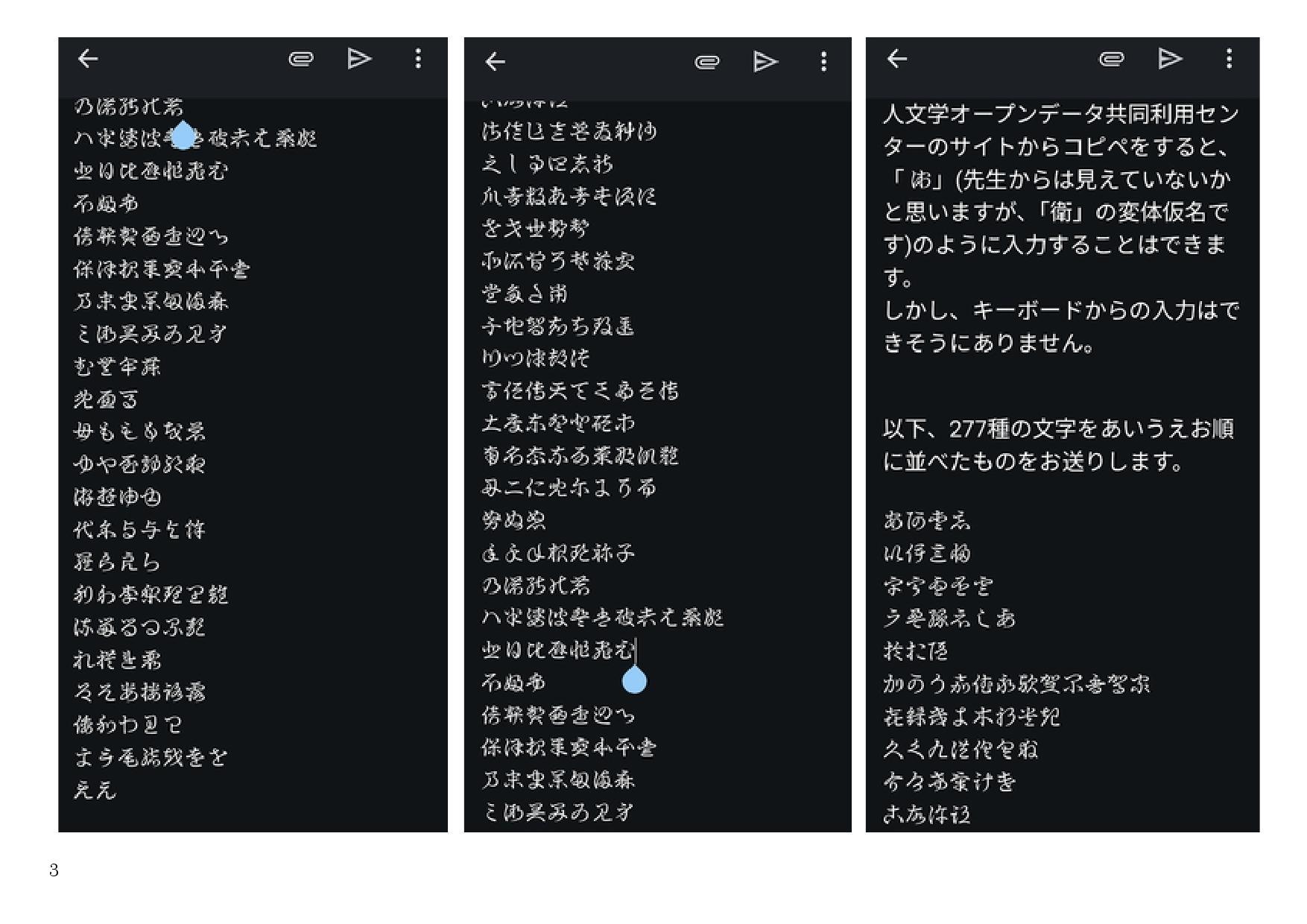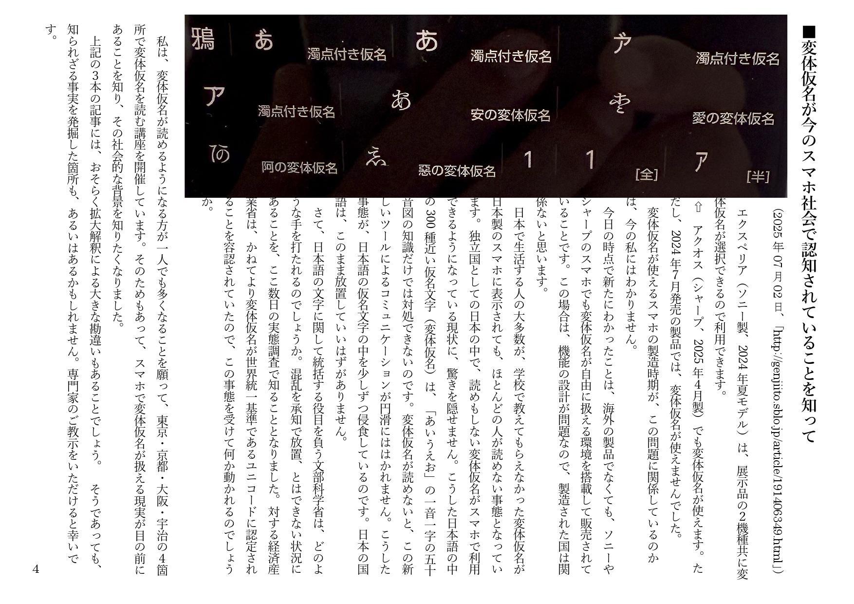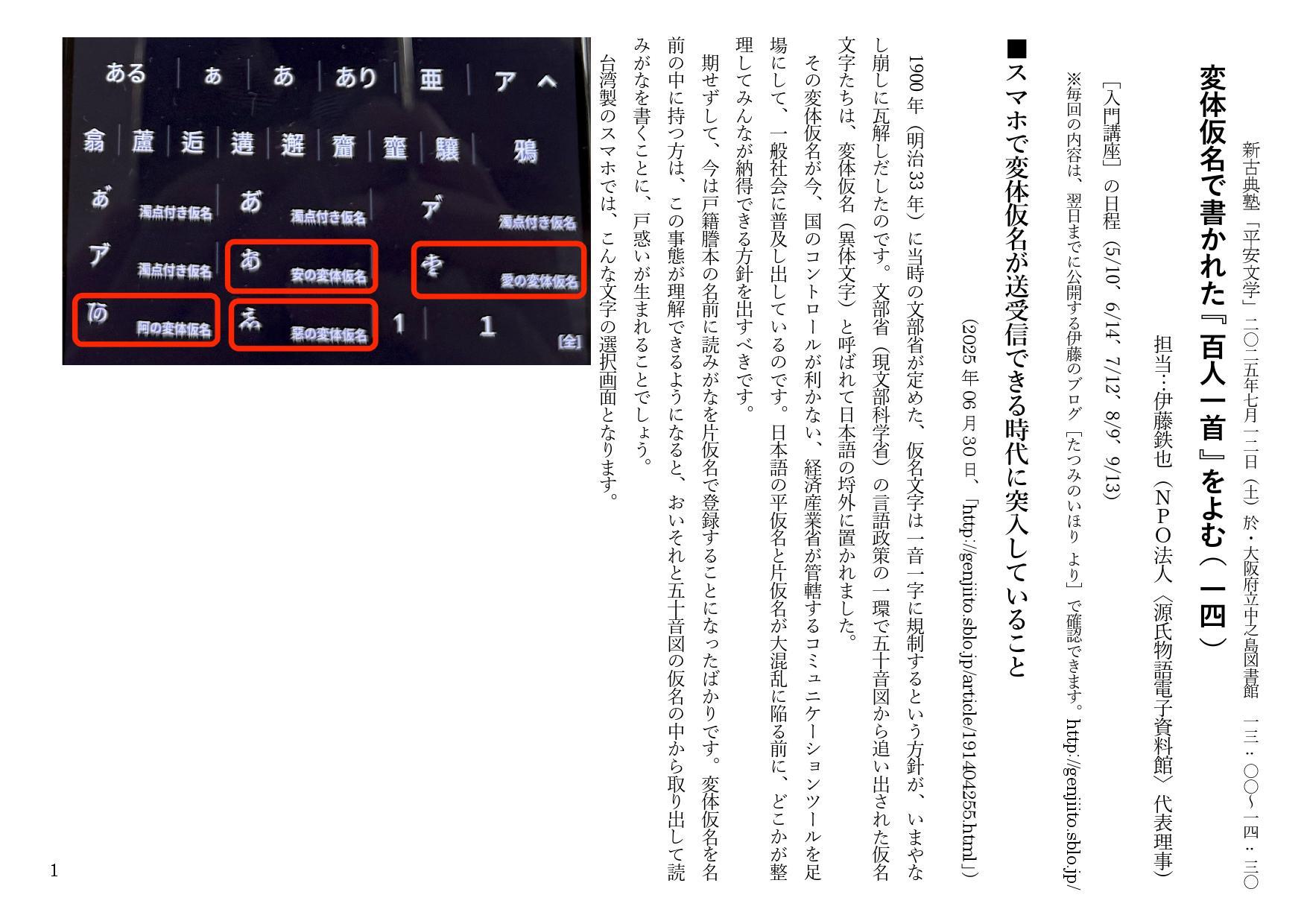 まず最初の3枚の資料は、すでにブログで報告したことを取り上げて、現在問題があると思っていることをお話しました。ブログでは、「■スマホで変体仮名が送受信できる時代に突入していること(2025年06月30日、「http://genjiito.sblo.jp/article/191404255.html」)と題して書いたことです。