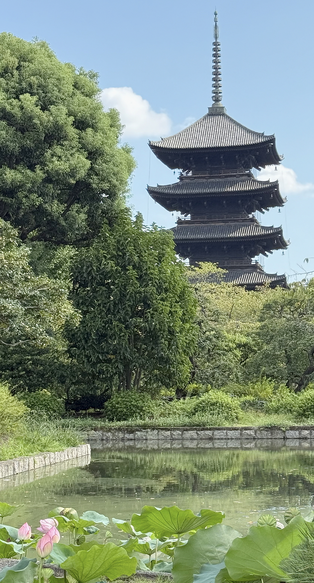 国宝の五重塔の手前で、蓮の花を入れて撮りました。