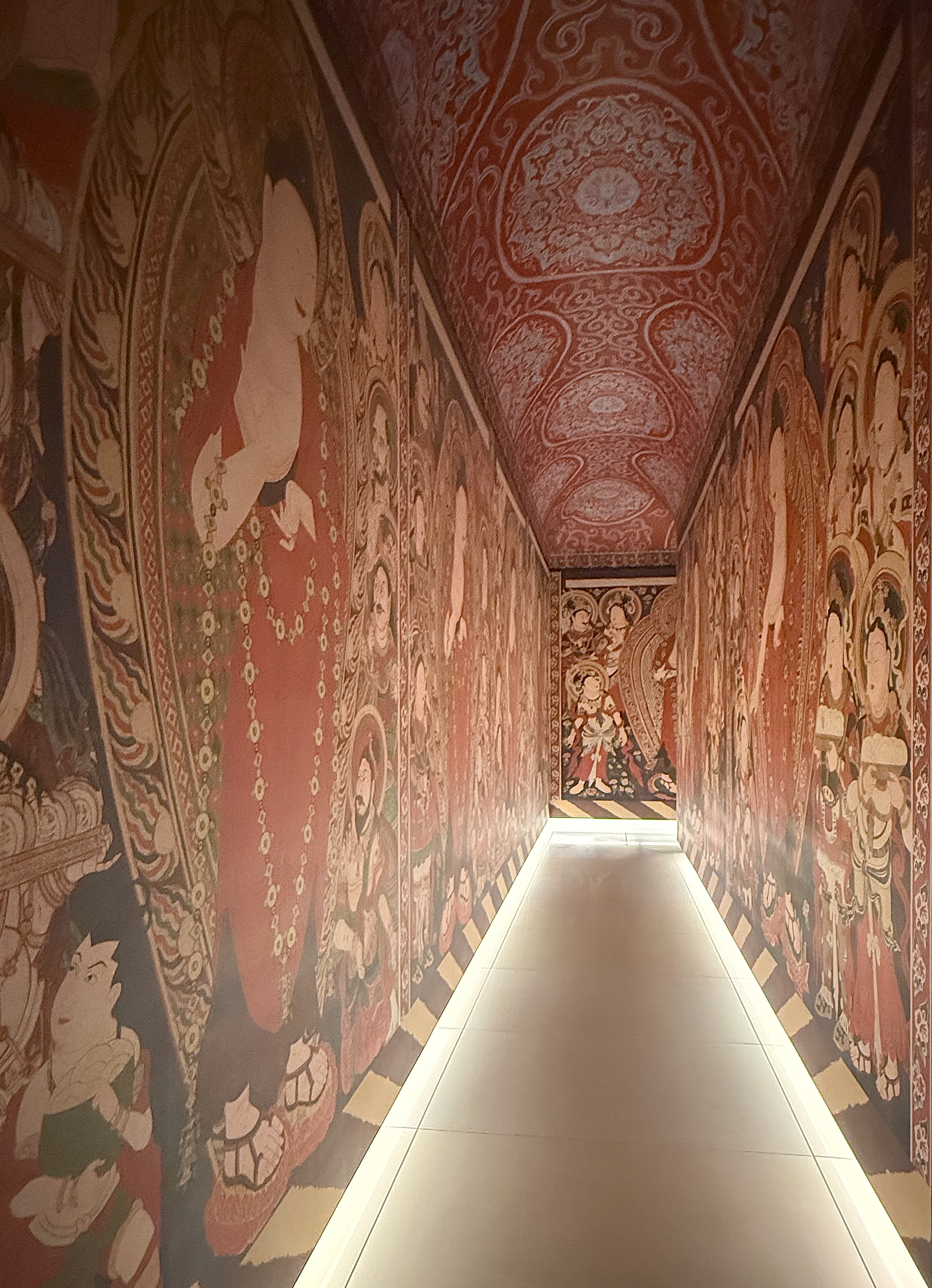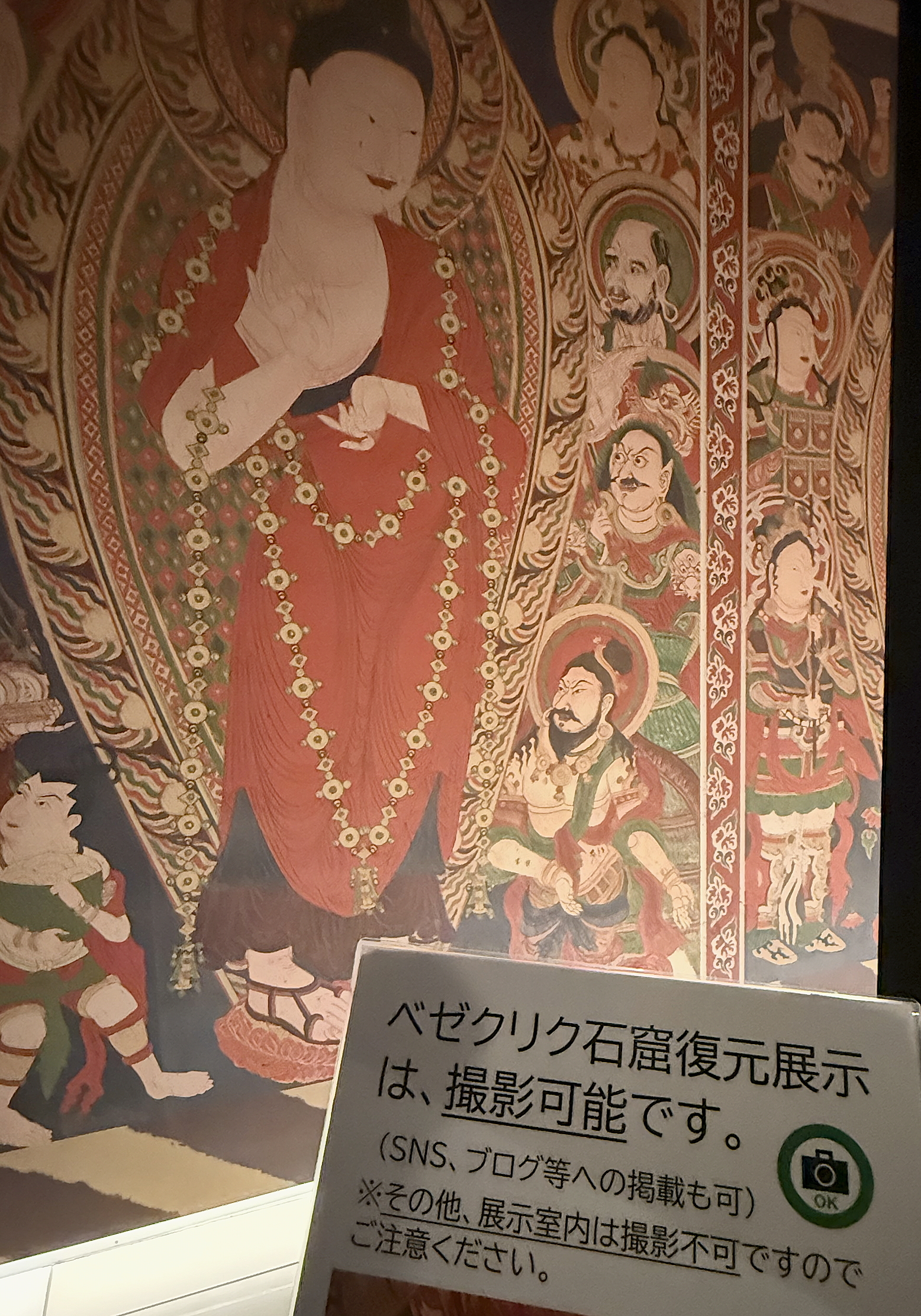 この内、「ベゼクリク石窟」については、石窟15号窟回廊壁画が龍谷大学古典籍デジタルアーカイブセンターで実際に復元され、その石窟の中を自由に歩いて仏教石窟の雰囲気を体験することが出来ました。ただし、回廊の幅は実際には1.2mであっても、今回は安全確保のために1.5mにしている、とのことでした。