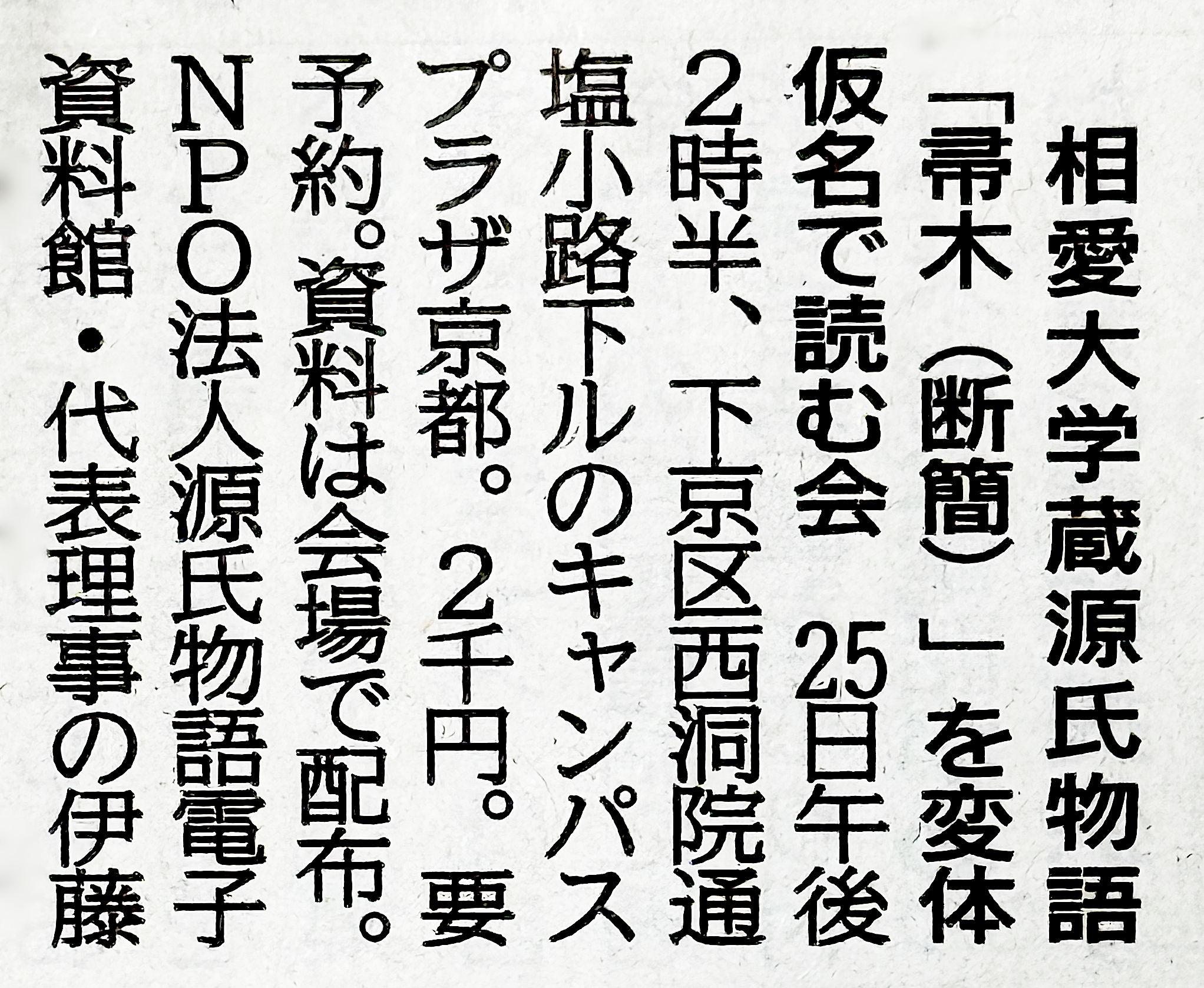 昨日の京都新聞「まちかど」欄(京都市)に、NPO法人〈源氏物語電子資料館〉が主催する、相愛大学蔵源氏物語「帚木(断簡)」(春曙文庫)の本文を変体仮名で読む会の案内記事が掲載されました。前回から「帚木(断簡)」がスタートしています。