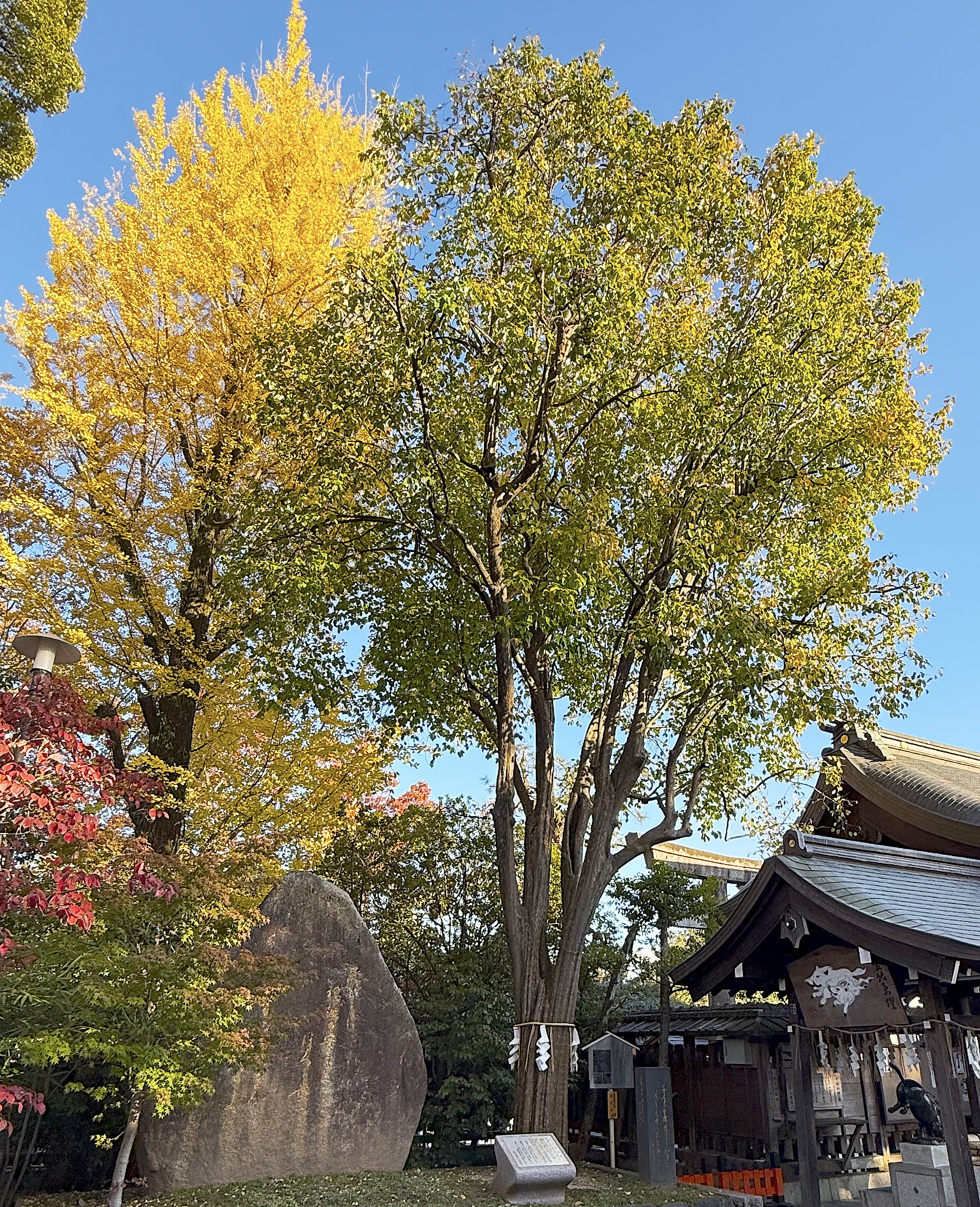 受付で、護王神社の境内の神木であるカリンの木になった果実をいただきました。右側の木が、区民の誇りの木として名木百選に選定された、樹齢100年以上の「ぜんそく封じの御神木」です。今年は、カリンが大量に獲れたそうです。