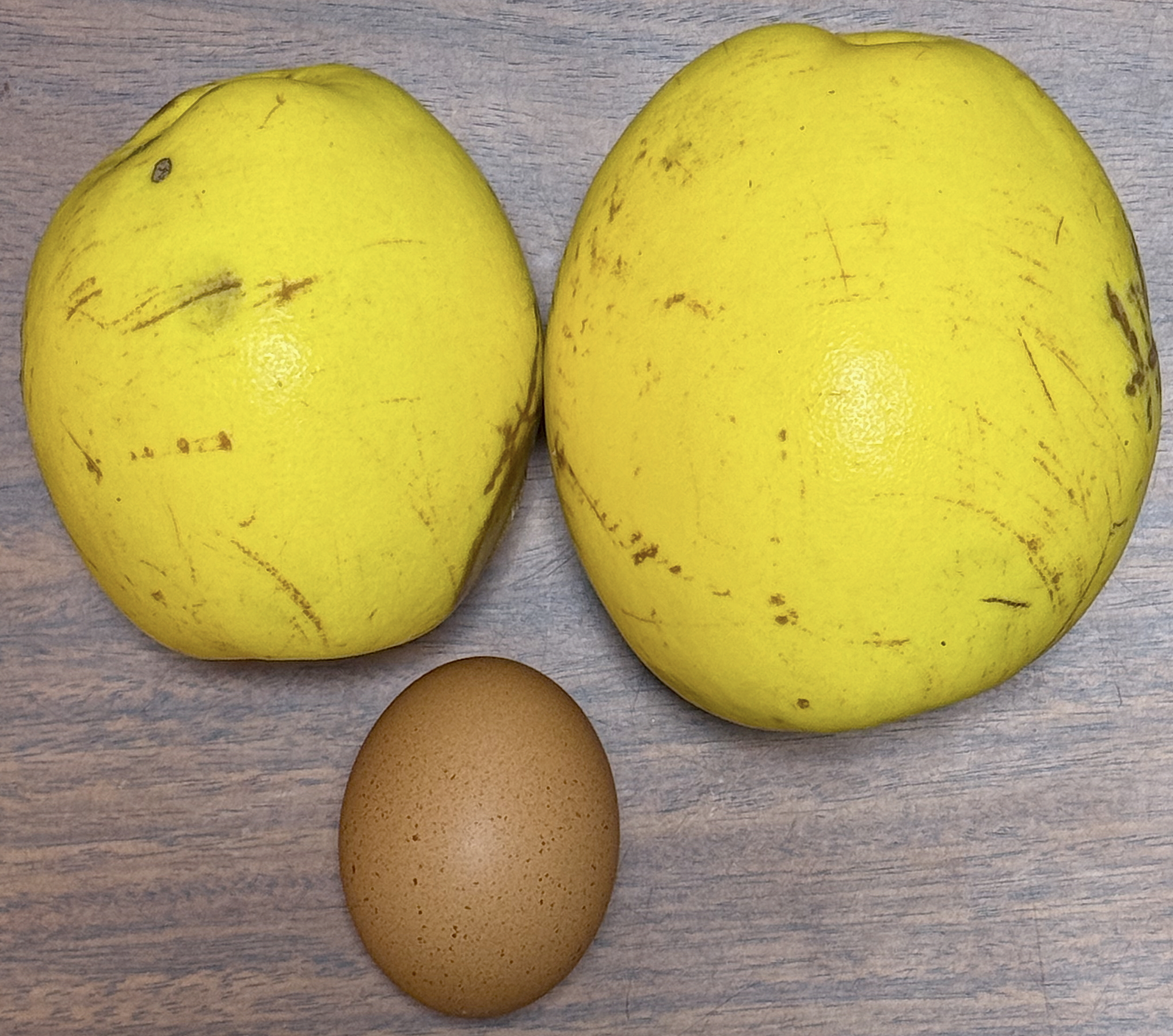大きさがわかるように、卵と一緒に並べて写しました。立派なカリンです。