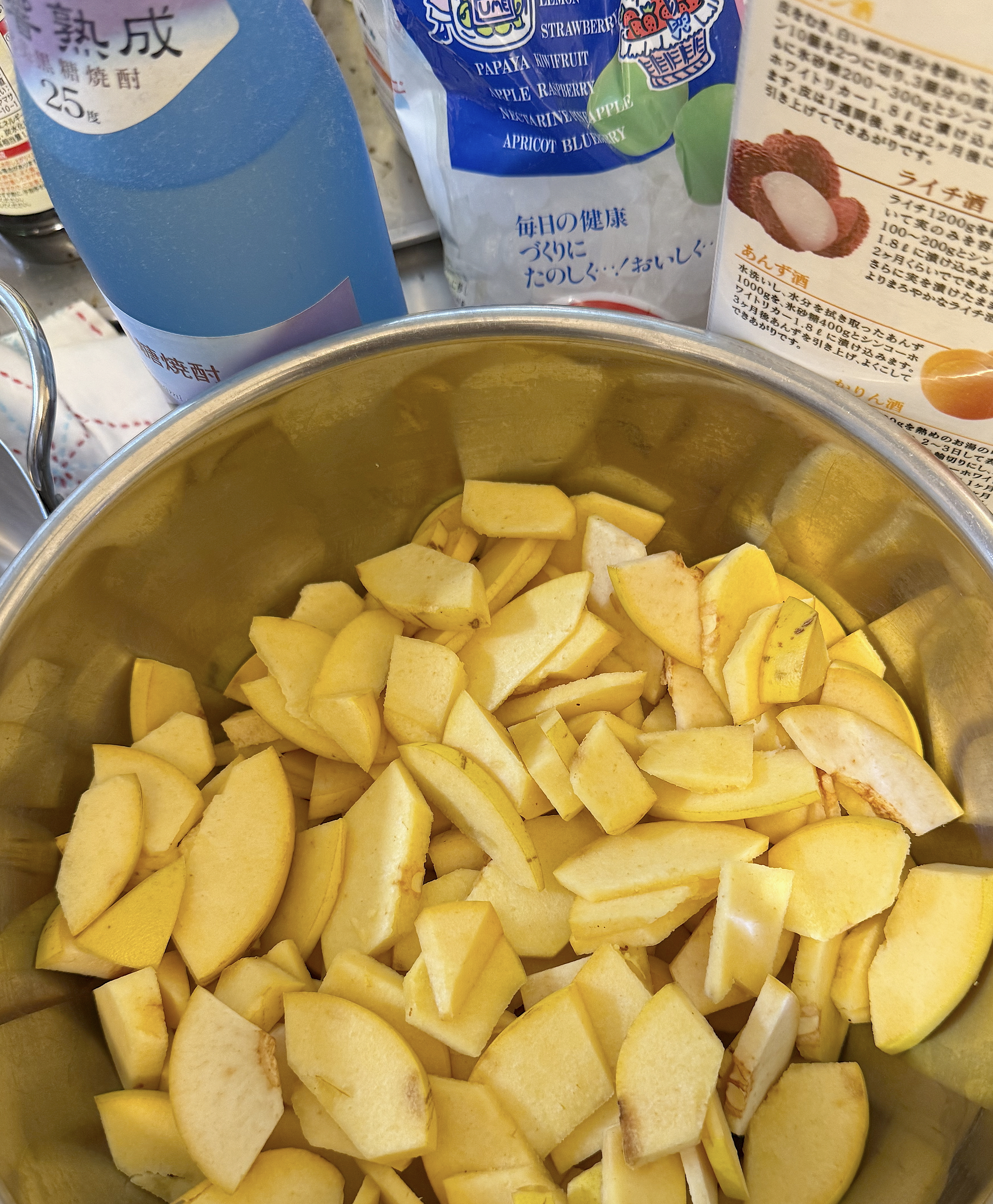 そして今、妻がカリンの実を剥いて切り、カリン酒を作る準備をしているところです。さて、どんなお酒ができますか。私はノドが弱いので、カリン酒は特効薬になりそうです。大いに楽しみにしています。