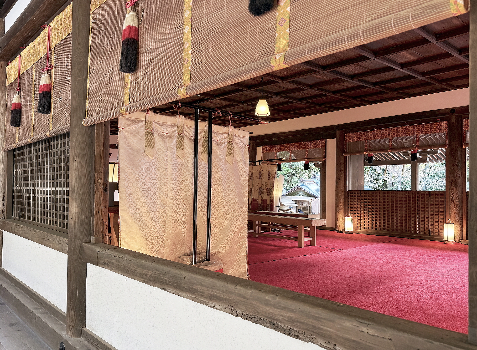 鎌倉時代前期に伐採された桧が使用されている拝殿は、1000年前の寝殿造りの実際が見られます。