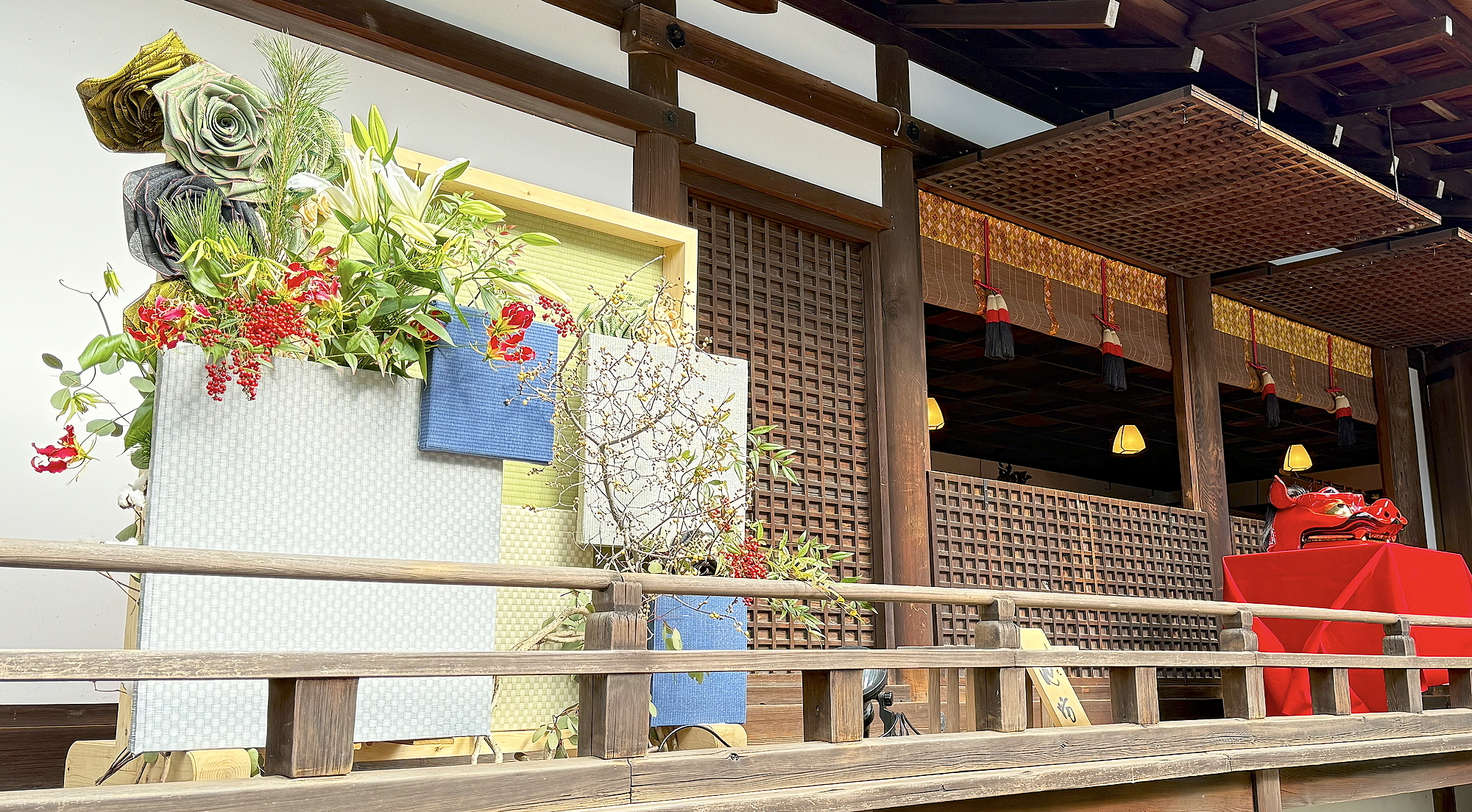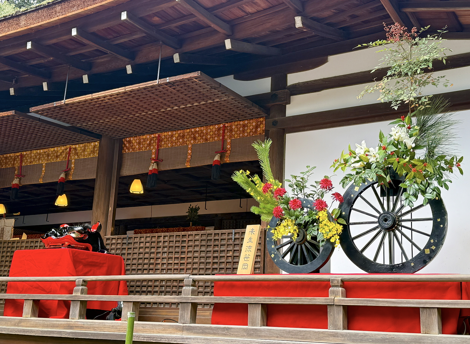 その正面の半蔀の前には、2流派のお花が生けてありました。