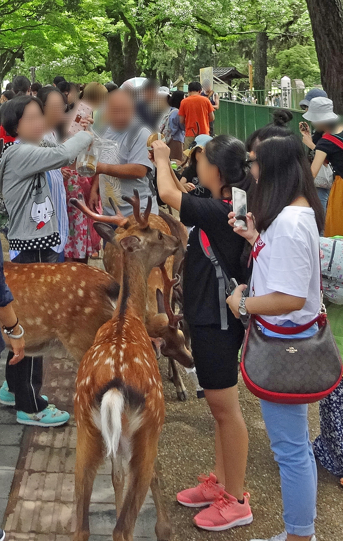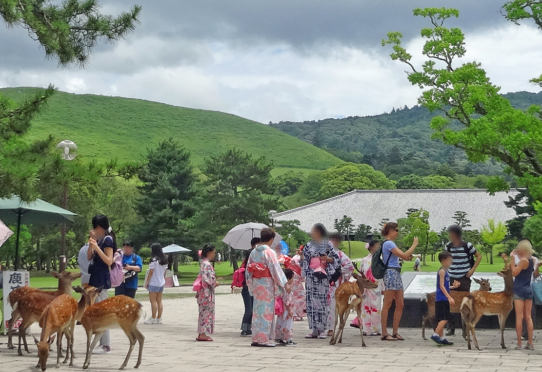 猿沢池に降りるところで、鹿さんたちがのんびりと草を食んでいました。見慣れた奈良の風情です。