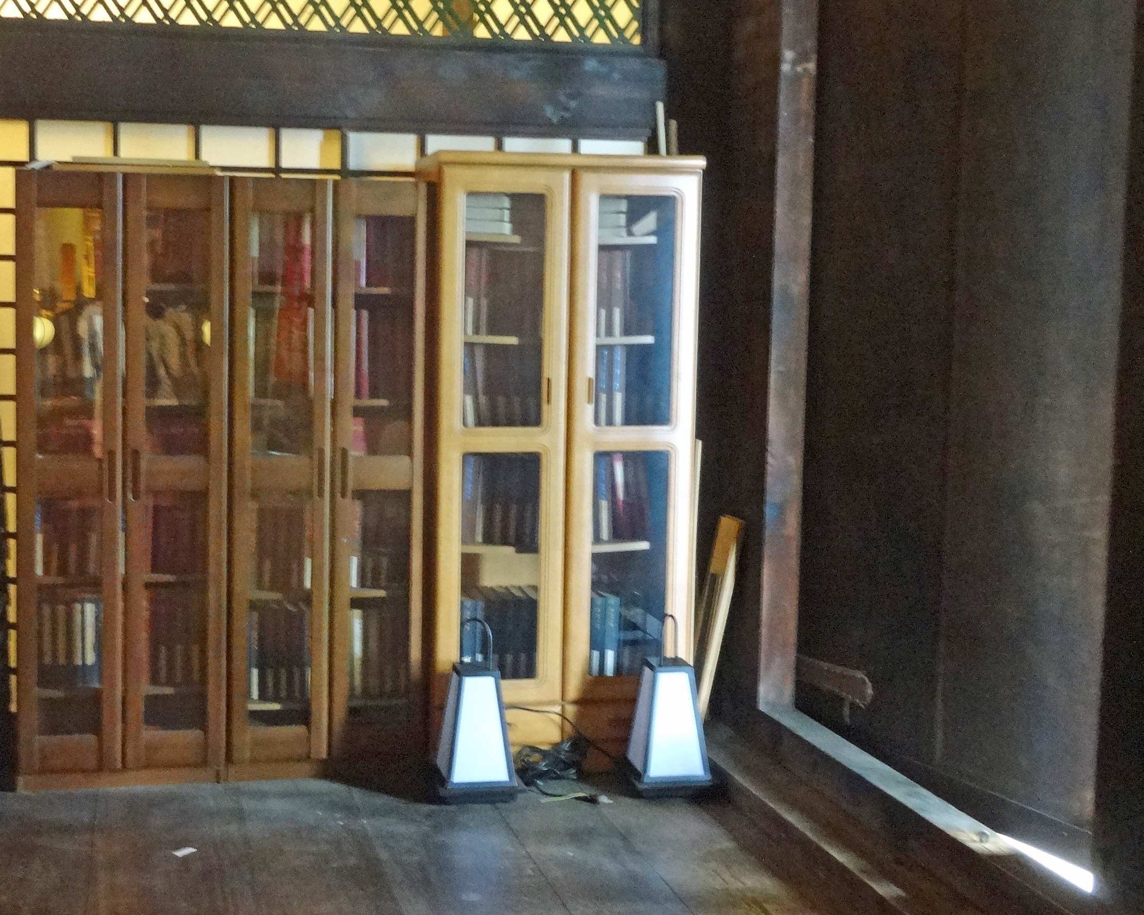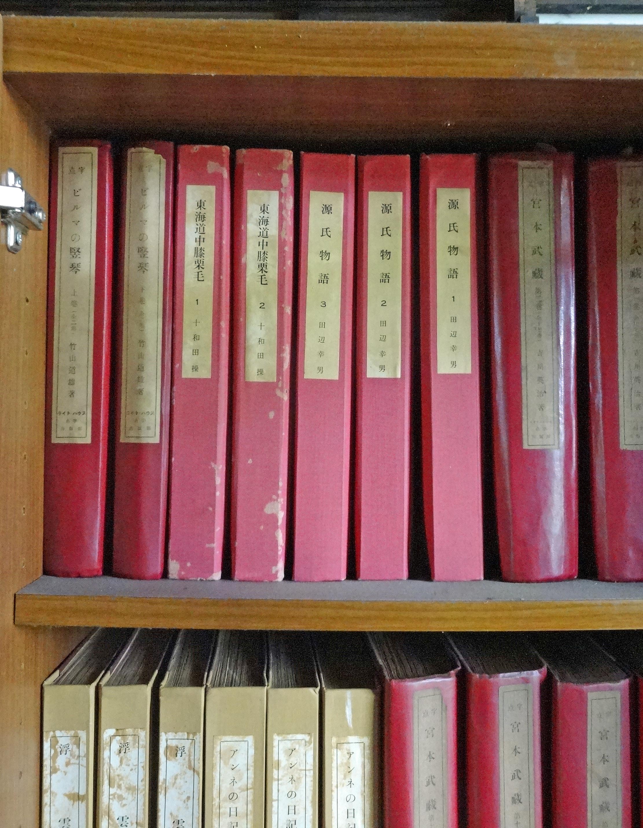 それが、今日は見当たらないのです。いらっしゃったお坊さんに伺うと、今はガラスケースで陳列はしていないが、点字本は今もあるとのことです。ご丁寧にそのケースがあるところまで案内してくださり、暗いからというので大きな観音開きの戸を開けて、ケースの中を見せてくださいました。確かに、以前のままに書棚に『源氏物語』や司馬遼太郎の作品が並んでいました。