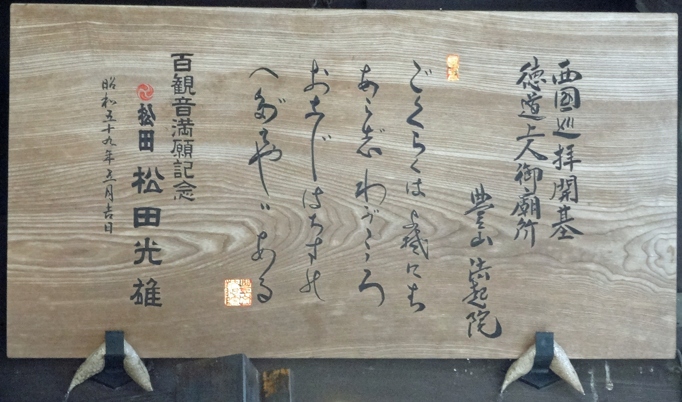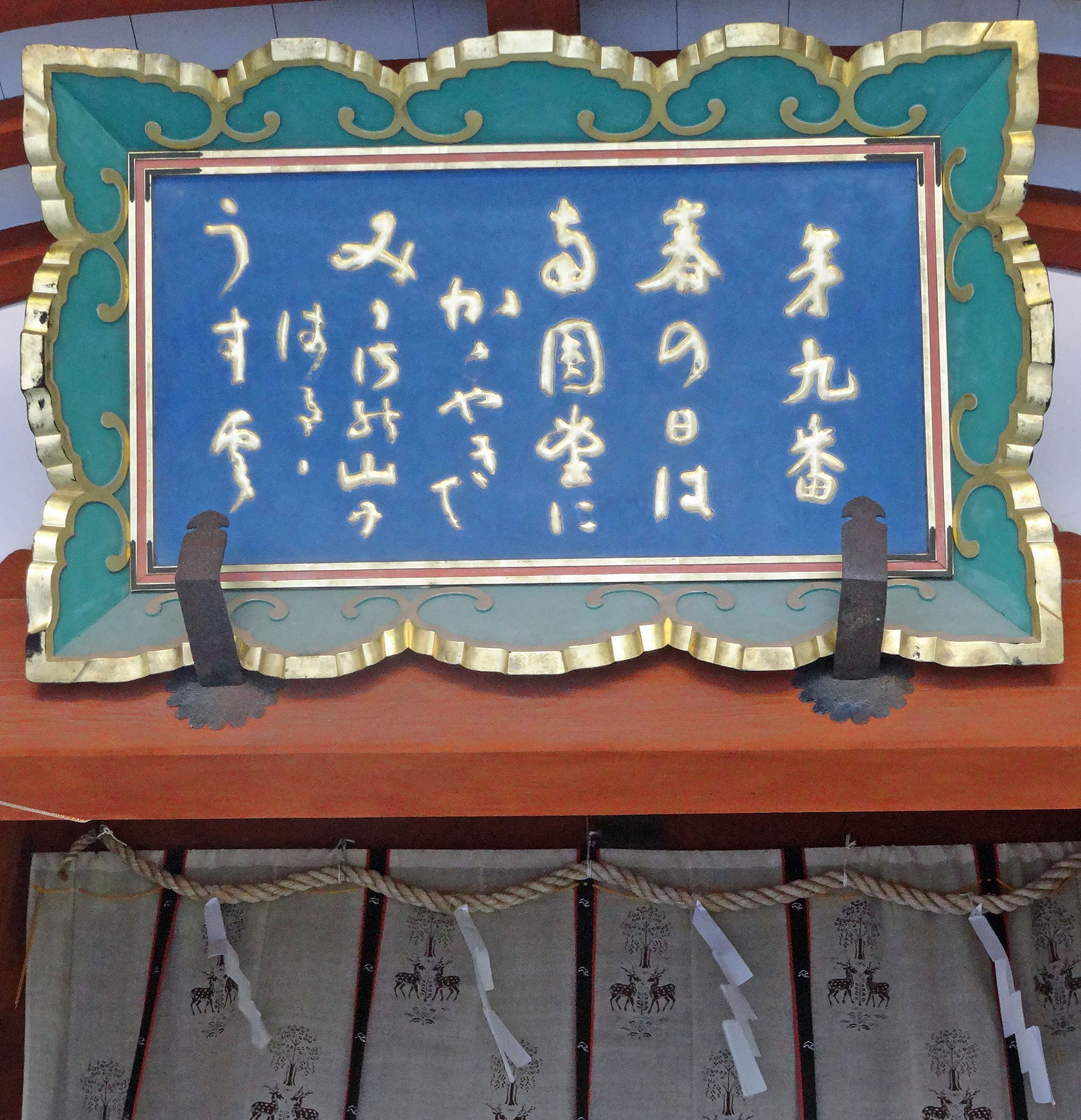 頭上に掲げられた額には、次のようにご詠歌が記されています。後ろから3行目には変体仮名が使われているので、書かれている仮名文字の字母に溯って正確に読める人は少ないと思われます。