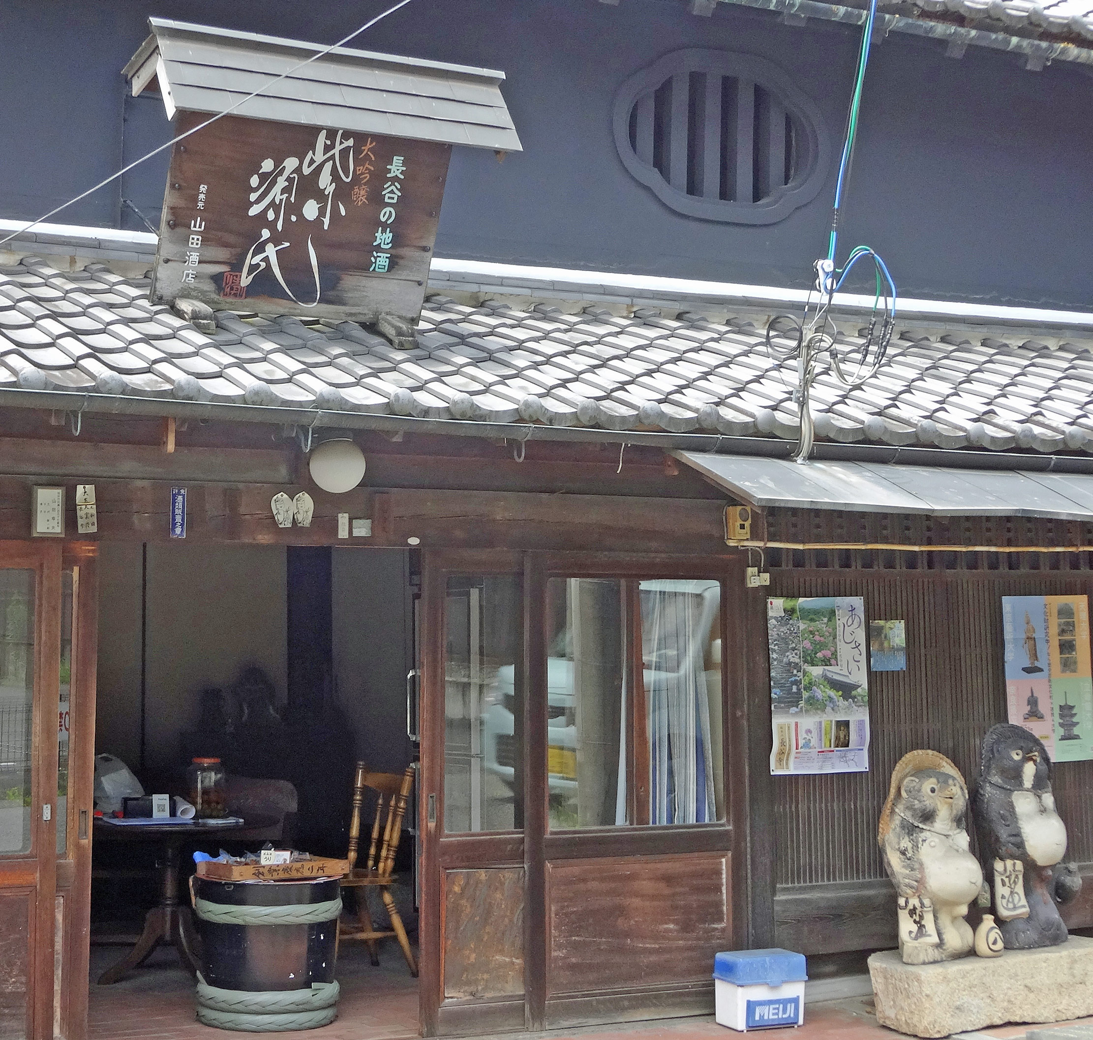 長谷寺に向う途中の門前通りで、「長谷の地酒 大吟醸 紫 源氏」という看板を見かけました。12年前にこの長谷寺に来た時には、ここでお酒をいただいたことは、「西国三十三所(25)長谷寺」(2010年10月26日)の後半に書いています。このあたりのお店のほとんどがシャッターを下ろしていることもあってか、この酒屋さんの店頭にこのお酒は見あたりませんでした。