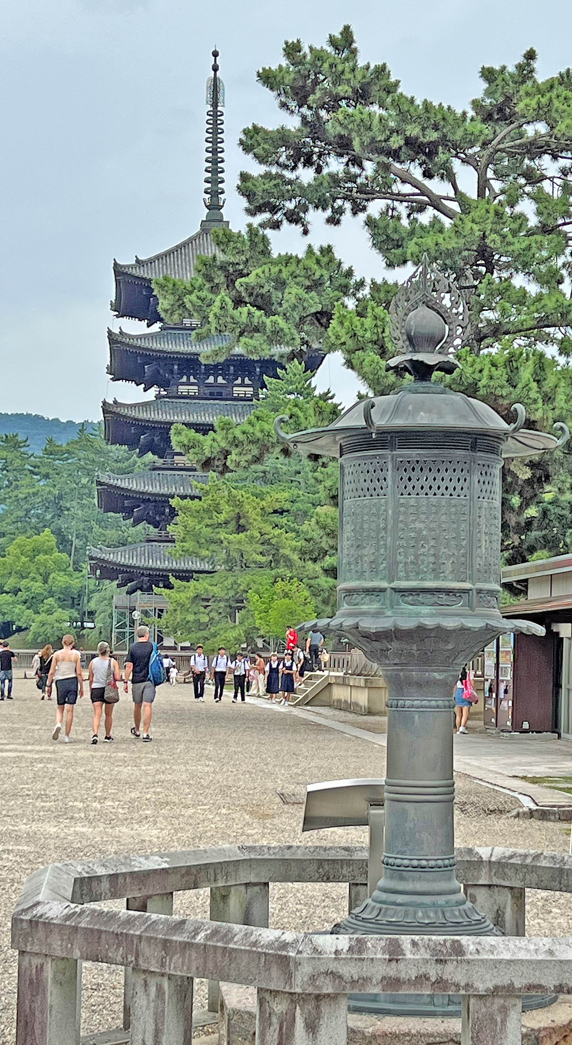 振り返ると、三笠の山を背景に国宝の五重塔が均整のとれた姿を見せています。