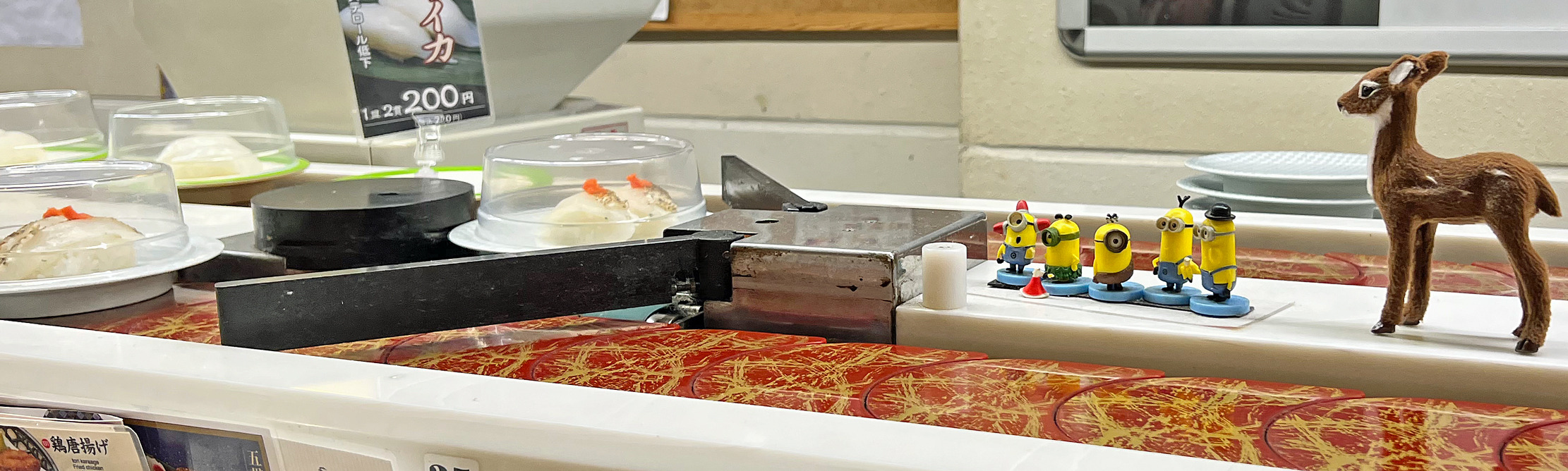 今日は、レーンの一部だけでの営業でした。注文は紙に書いて渡します。私の右横には、多くの海外の方が並んでおられます。お店にはお客さんがたくさんいらっしゃいます。しかし、目の前にお寿司は流れて来ません。私の少し左前で、お寿司はゲートがあるためにUターンします。