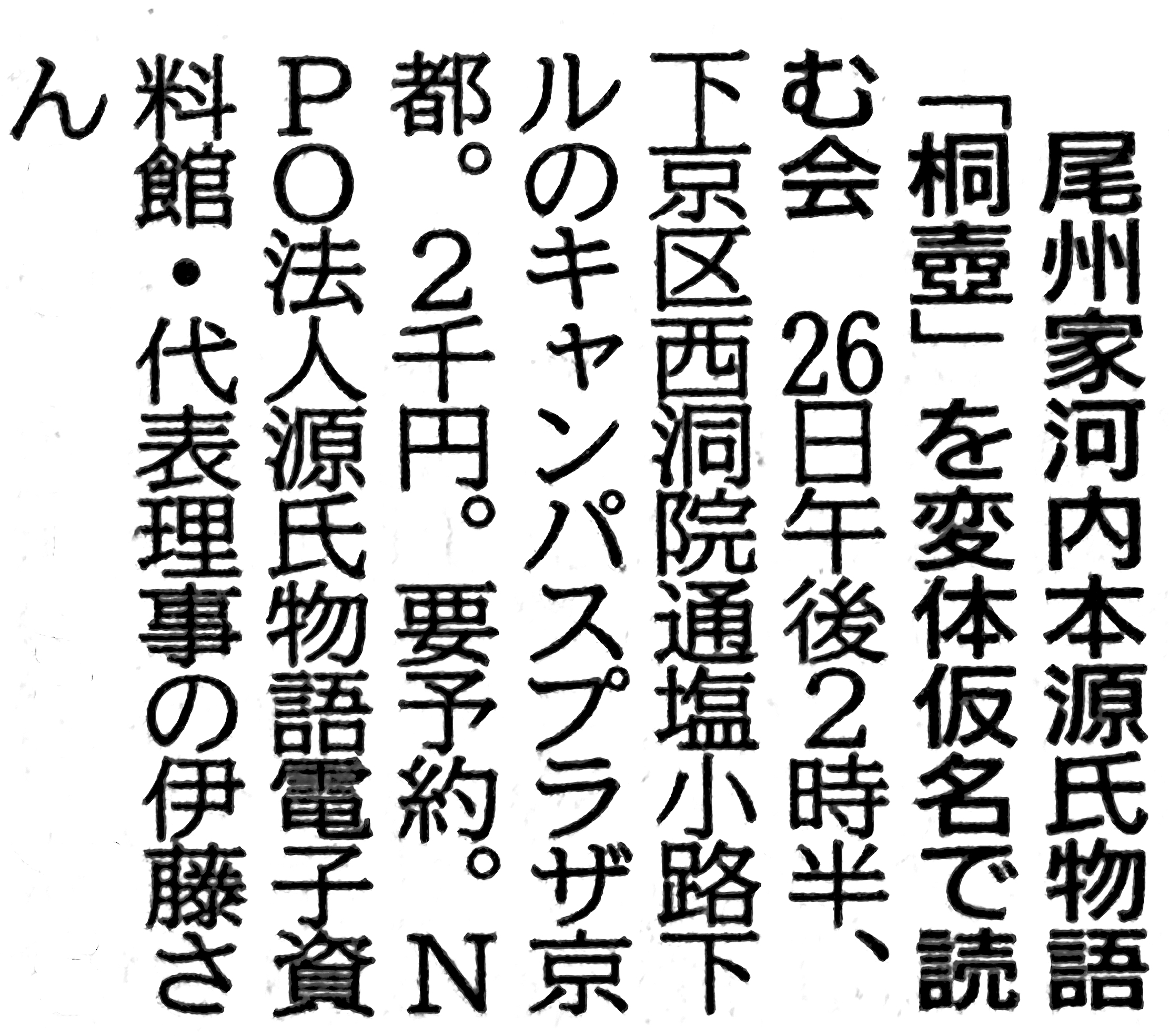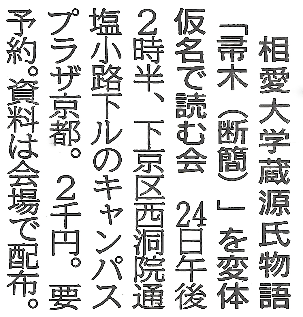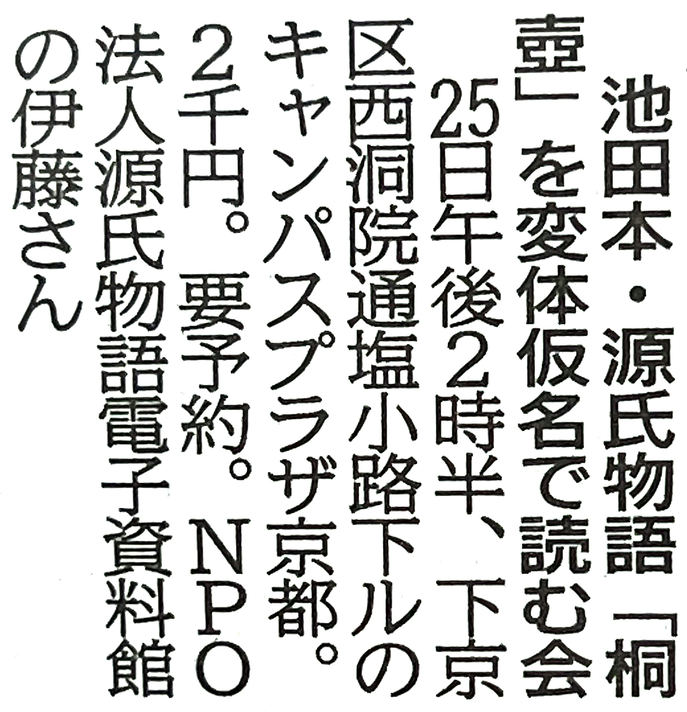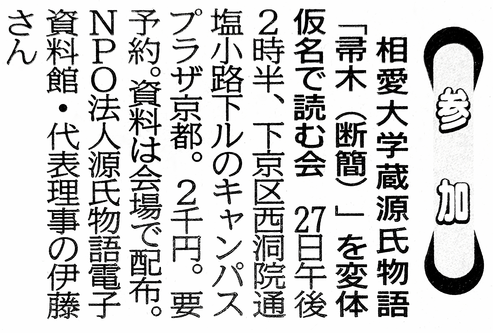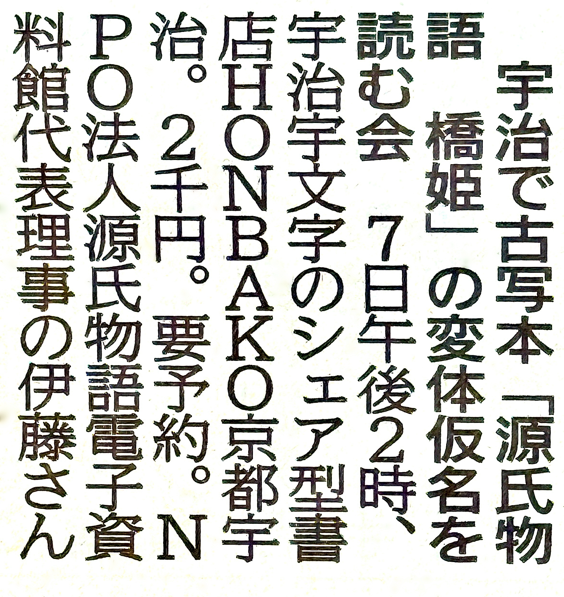 京都新聞の山城版「まちかど[宇治]」に、NPO法人〈源氏物語電子資料館〉が主催する、「宇治で古写本『源氏物語 橋姫』の変体仮名を読む会」(第4回)の案内記事を掲載していただきました。