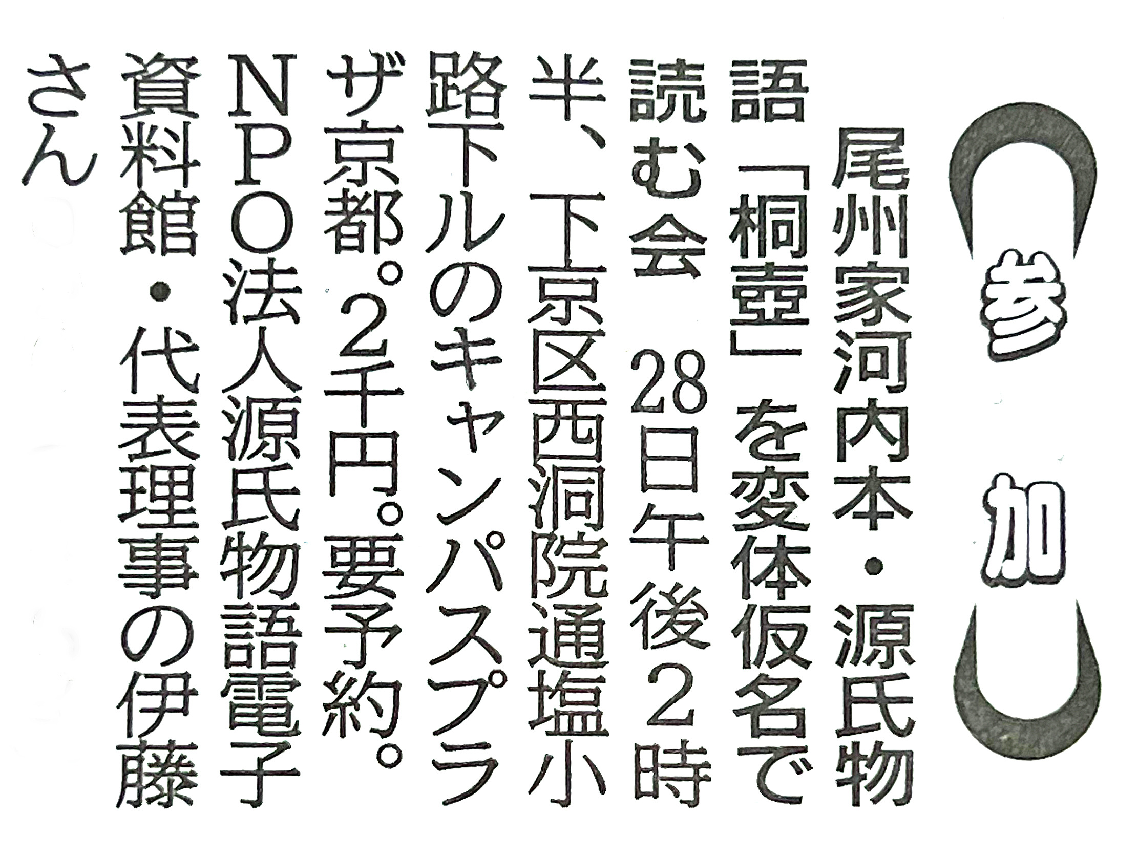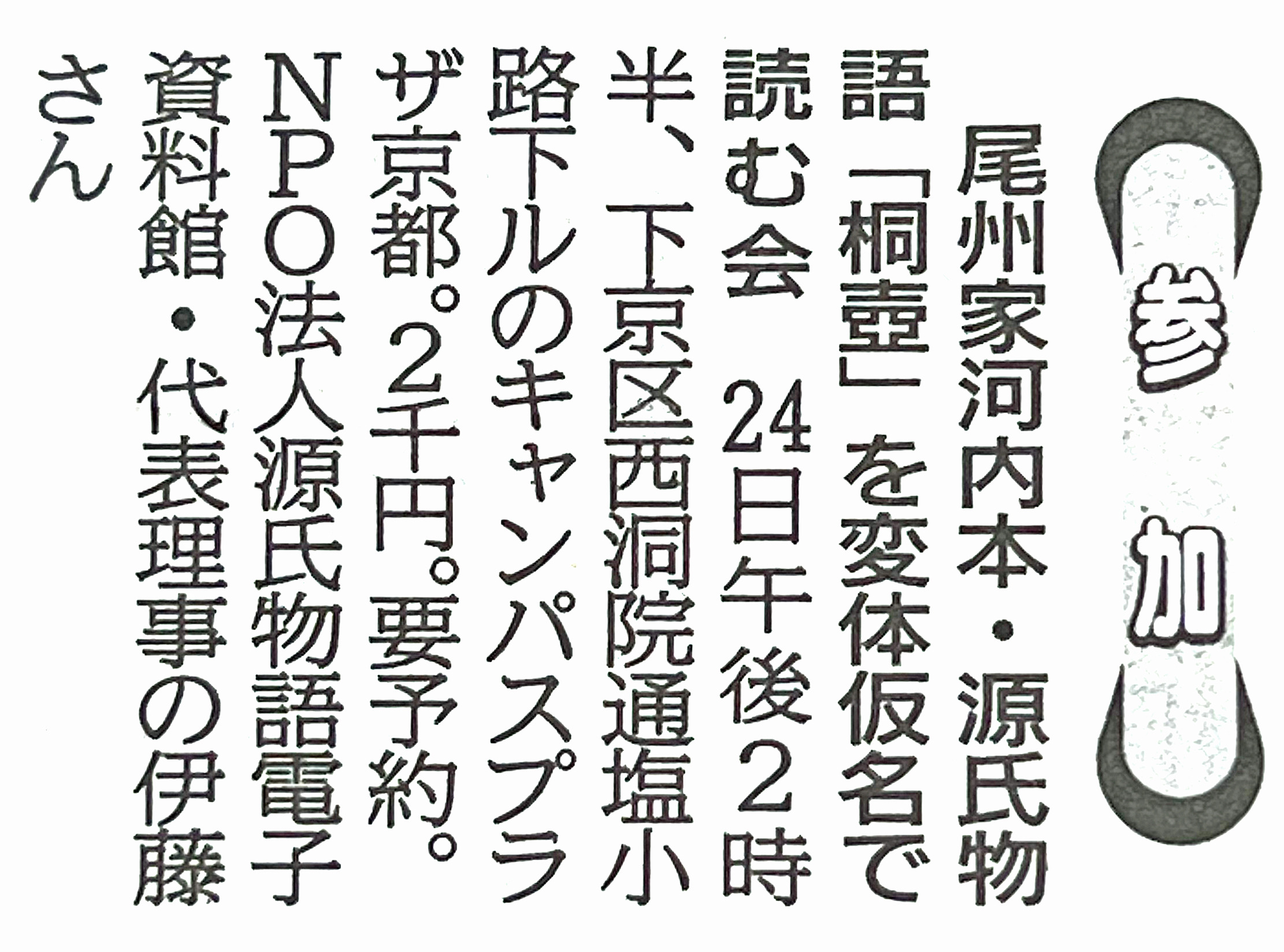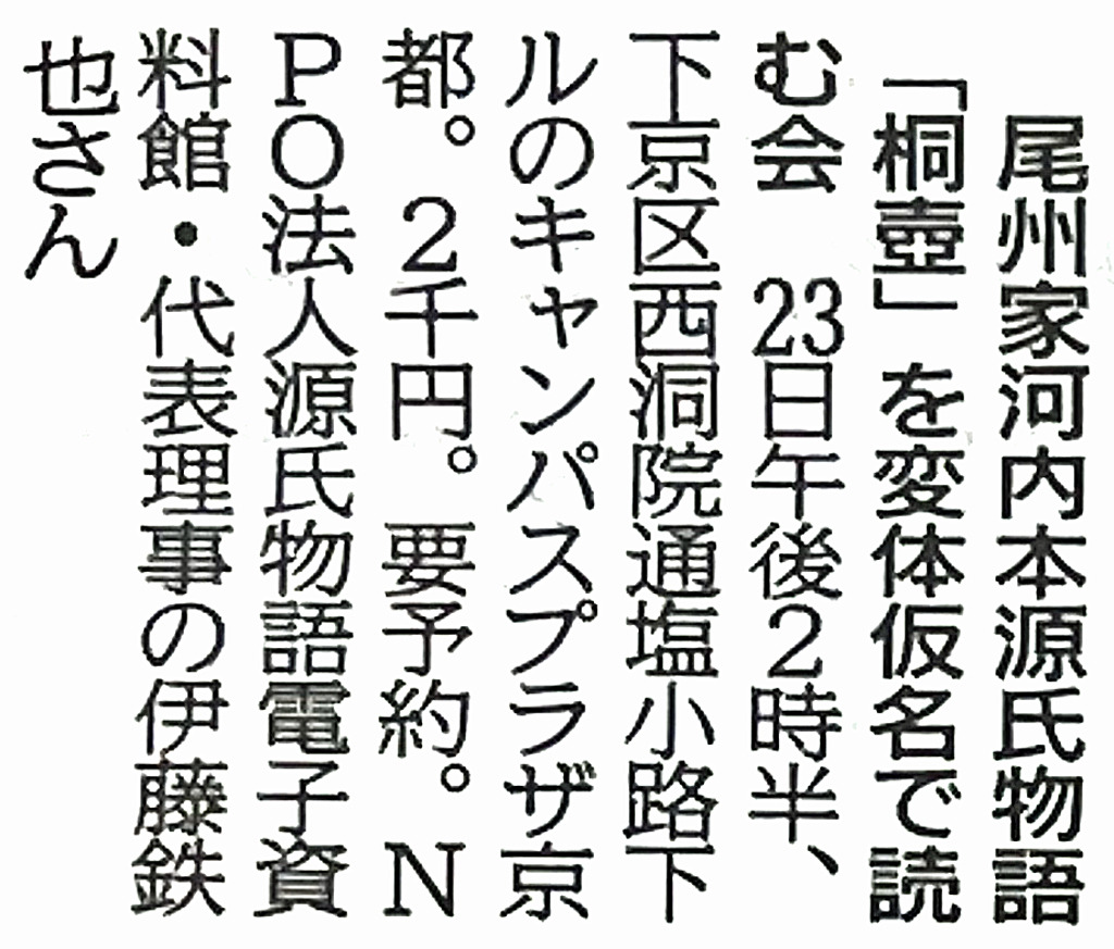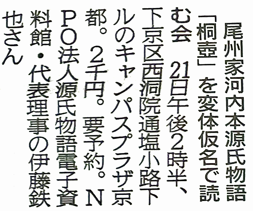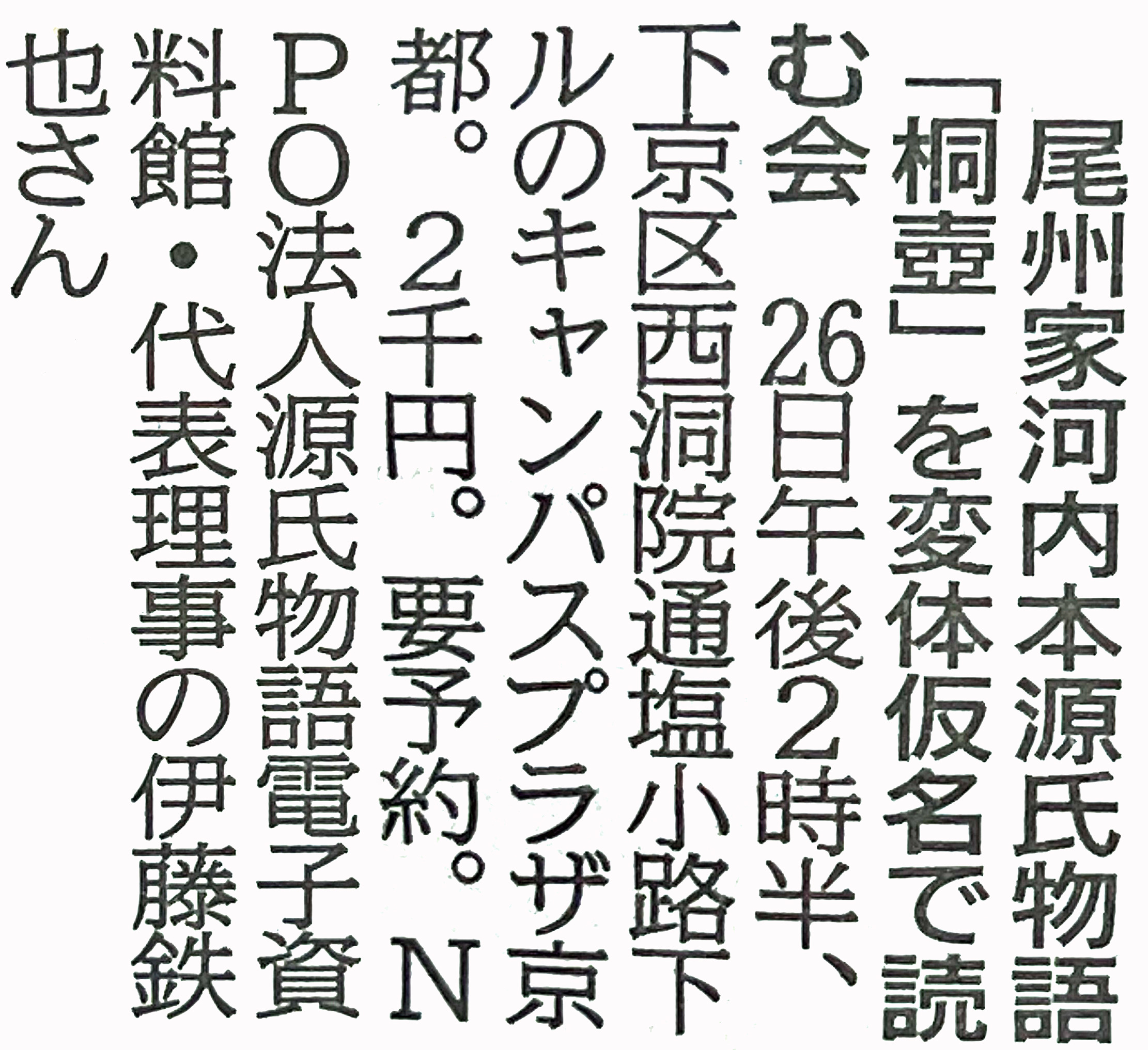 京都新聞の山城版「まちかど[宇治]」に、NPO法人〈源氏物語電子資料館〉が主催する、「宇治で古写本『源氏物語 橋姫』の変体仮名を読む会」(第4回)の案内記事を掲載していただきました。