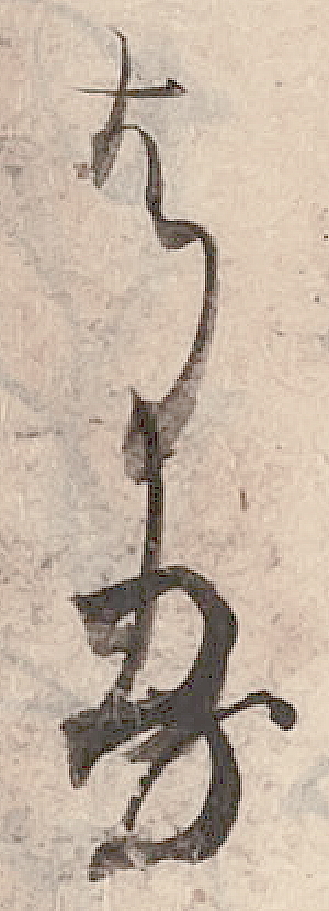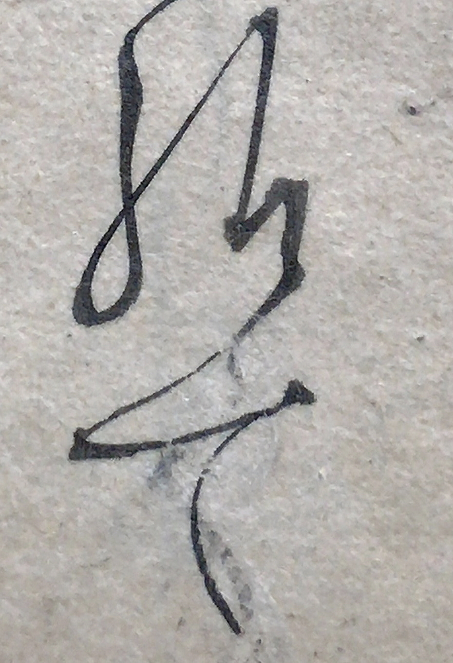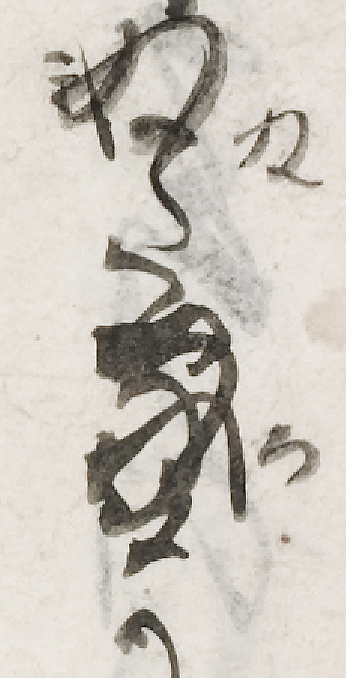 これは、下に伸びる線が一旦右に折曲がる形の場合は「介」、下に伸びる線が真っ直ぐに次の文字に続く場合は「个」とする、という私見に基づく読み分けです。次の写真を見ていただければ、その微妙な線の流れがわかると思います。「个」めったに見かけないので、ここでの例は貴重です。