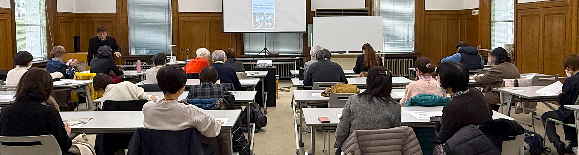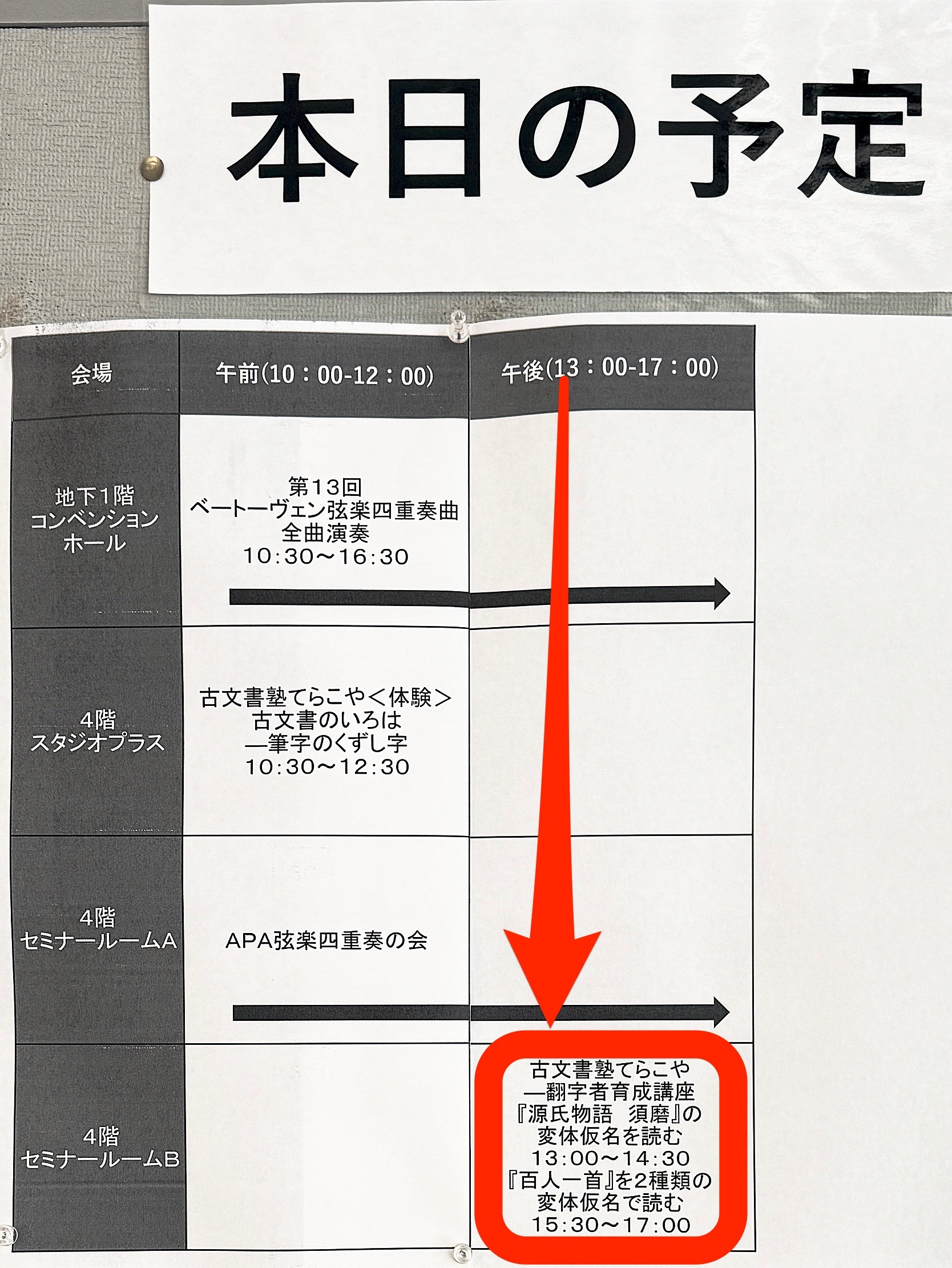 この展示室の隣の部屋が、私が担当している講座の会場である多目的室2です。今日も、この部屋で、『百人一首』と『源氏物語』の講座がありました。