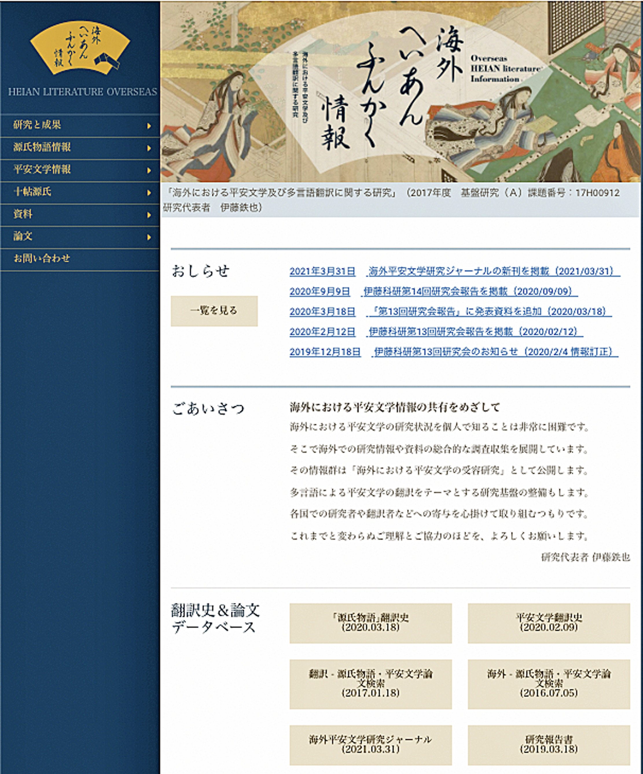 本年の春先から、「海外平安文学情報」(https://genjiito.org/)に不具合が発生したために、このサイトが長らく閲覧できなくなっていました。多くの方々からお問い合わせをいただき、再開までのいましばらくの猶予をいただいていました。